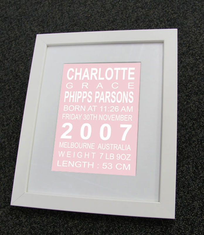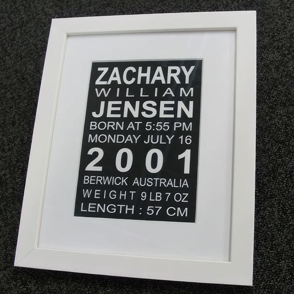 Please enter ALL details for your Birth Announcement Frame. Childs name, time and date of birth, place of birth, length and weight at birth.